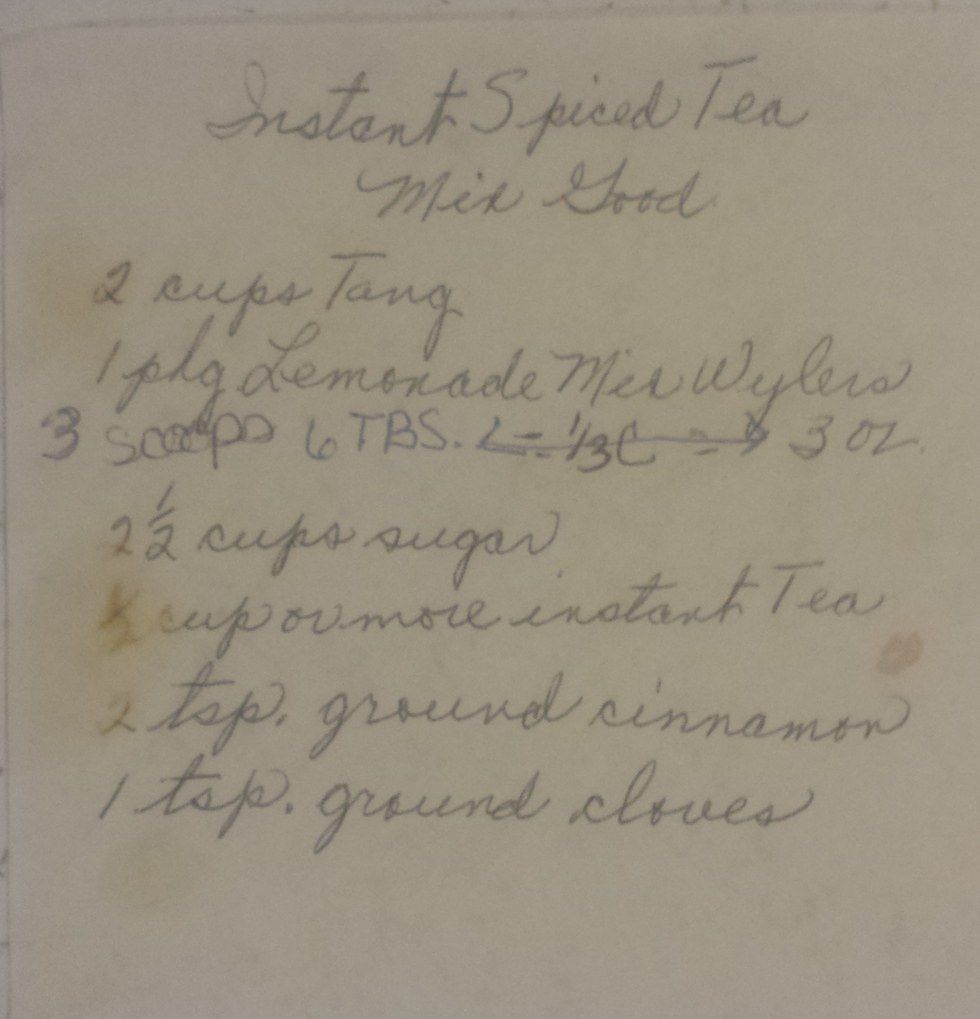 This next recipe is my grandmothers, who sadly will not be celebrating Christmas with us this year. In memory of her, here is her Spiced Tea Recipe. Just add the mixture to hot water to taste and “Mix Good”. Trust me, it is delicious, and I have many fond memories of drinking it with her! This is a bulk recipe, so make it at home and bring it to school with you, or use it all winter!