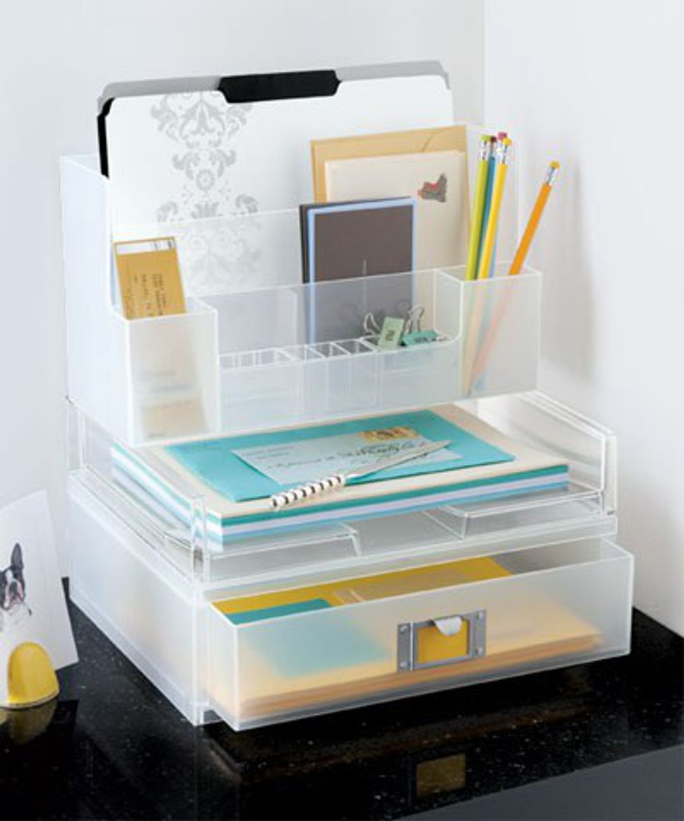 Your college dorm desk is probably larger than the one you have at home if you have one at home; however, with your living space being cramped, things tend to pile up on your desk. In order to give you the maximum amount of space, buy organizational products that stack into each other and/or can fit in a desk drawer. This will keep you more organized and will keep your desk free for your laptop, notes or food.