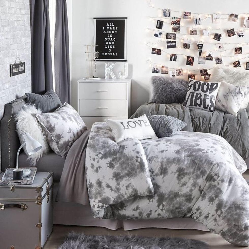 MARBLE. Marble is my favorite thing in this entire world, so the marble bedding is what definitely made me fall in love with this dorm room inspiration. I'm also a big fan of the "Good Vibes" pillow, the pictures with lights, and the feathery pillow and rug. I believe that there is too much grey and not enough white, but the room is definitely beautiful.