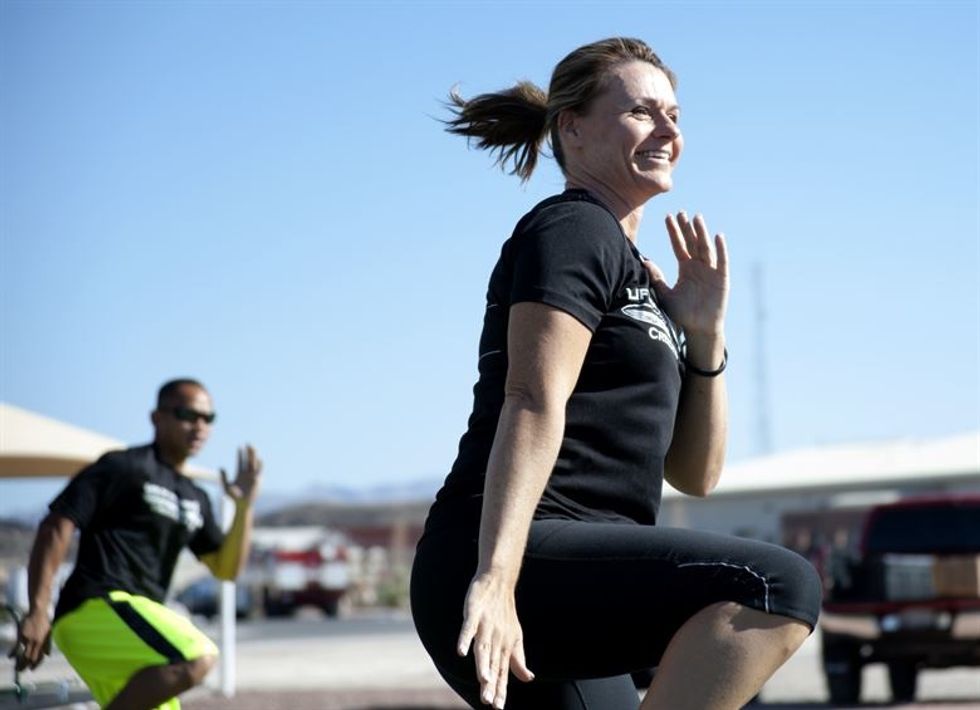 Stand with feet shoulder-width apart and drop your bottom below your knees. Hold for three seconds, then come back up to the original position.