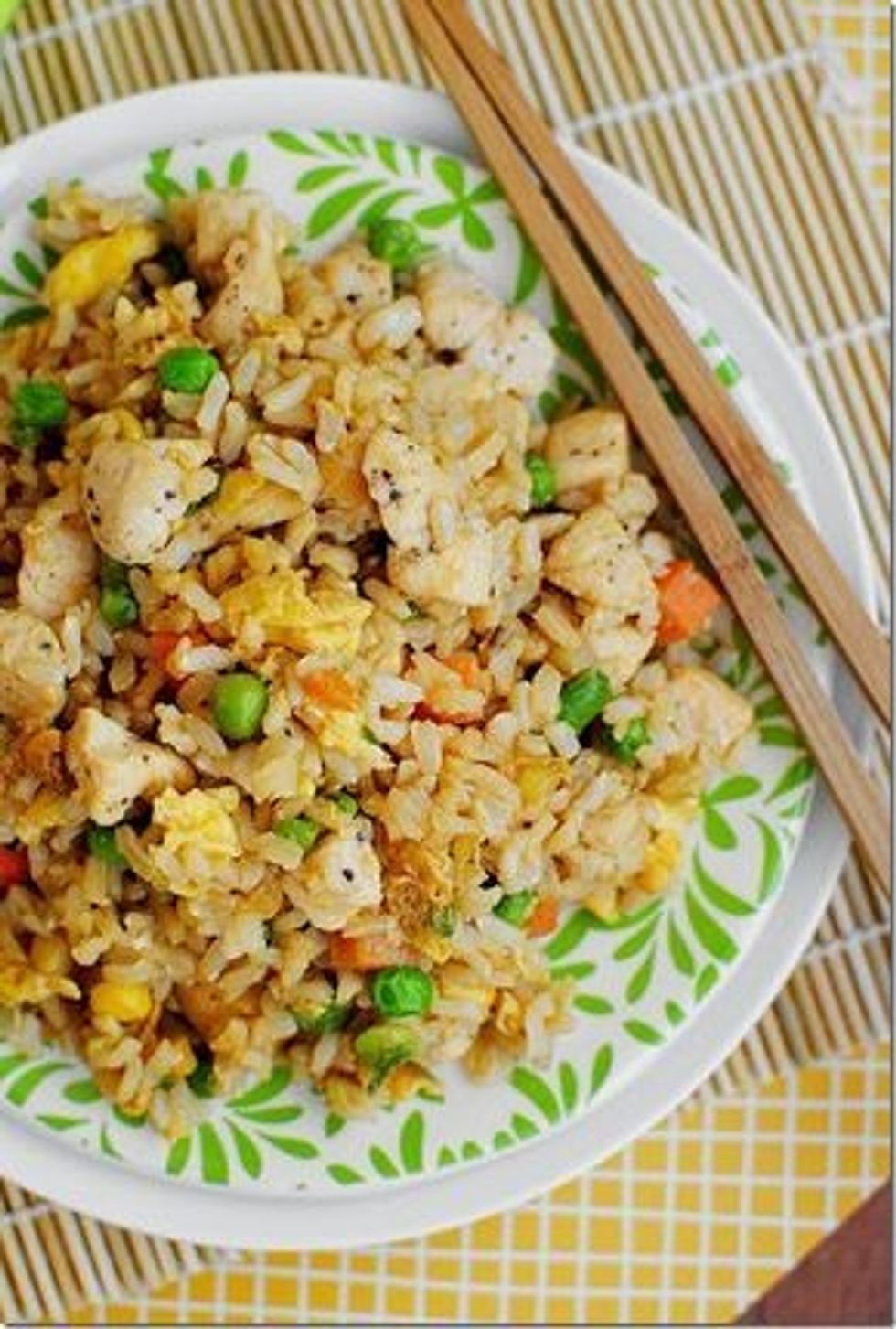 Grab a frozen packet of fried rice from the grocery store, heat it up in the microwave, and add shredded chicken from a rotisserie chicken or from the dining hall. You can also substitute shrimp, beef, or keep it vegetarian. Quick, easy Chinese food.