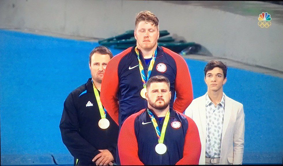 The man standing with his eyes closed in the picture below is Ryan Crouser, the 2016 Rio gold medalist for men’s shotput. He’s 23 and set an Olympic record in the event. He didn’t put his hand on his chest when the national anthem played, and neither did Joe Kovacs, the silver medalist in the same event, also an American.