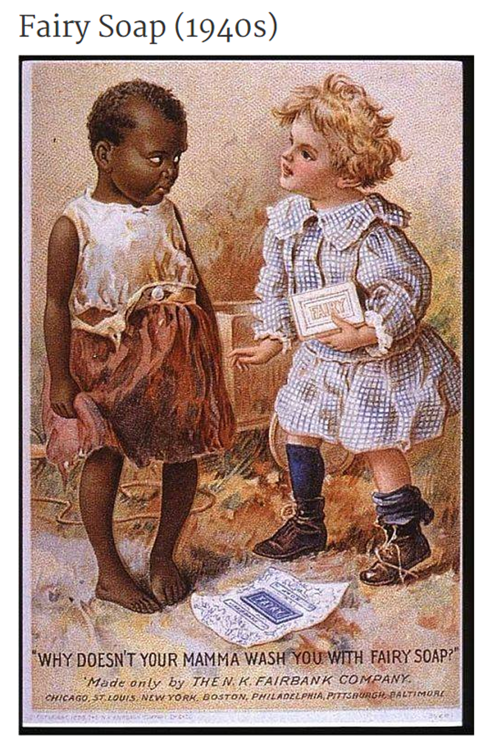 This advertisement seems to associate cleanliness and beauty with whiteness, while dirtiness is associated with being black. This is dangerous because it enforces stereotypes and continually maintains the principles of white supremacy. The advertisements purpose may not have been to offend but it was still released and Dove is not the only company to release offensive and racist advertisements.