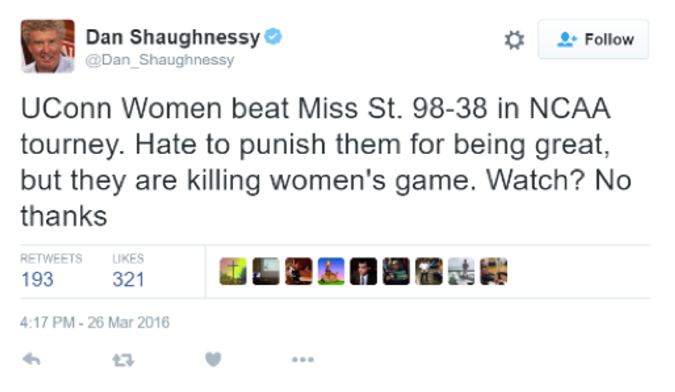 Dan Shaughnessy tweeted in March of 2016 after the Huskies blew out Mississippi State by 60 in the Sweet 16 round of the NCAA tournament.