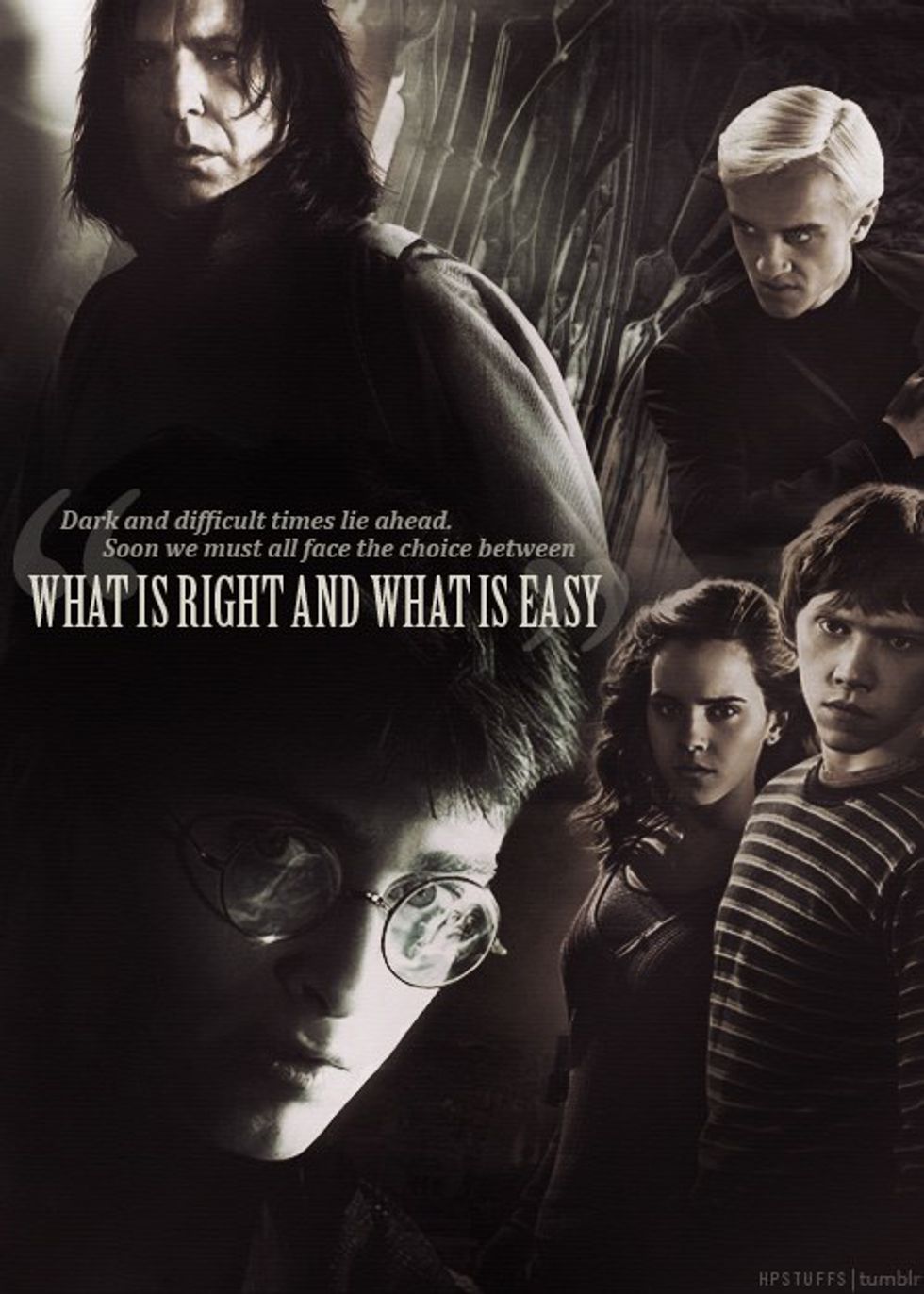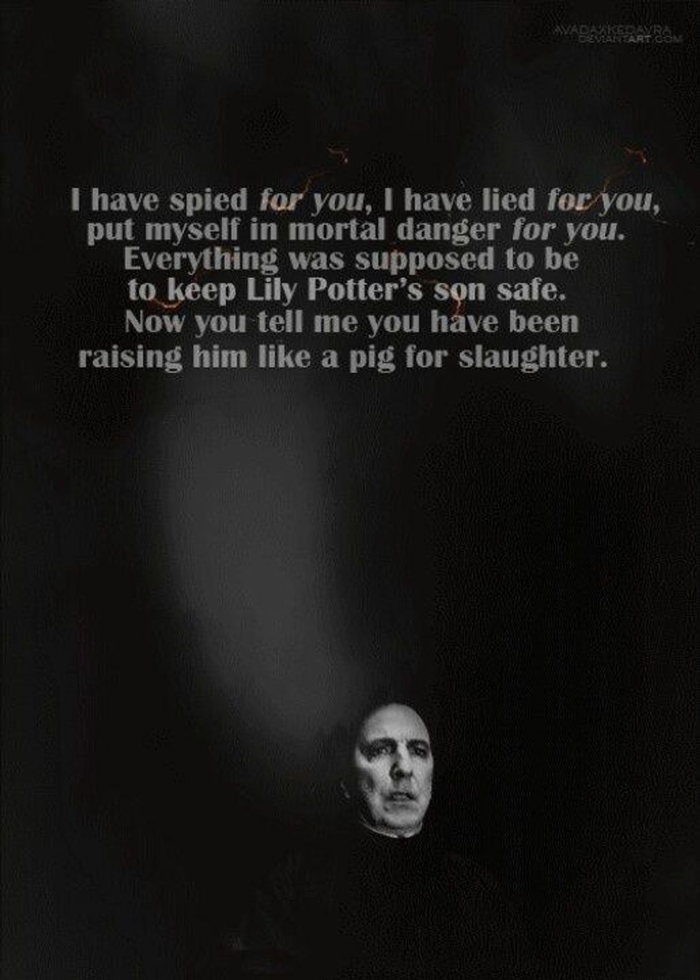 The last, and probably most important, similarity between the two is that they have been manipulated almost their entire life by powerful men. For Draco, it’s Lord Voldemort, possibly the most dangerous (and scary) wizard alive. He manipulates Draco by threatening his family and using him to do his dirty work (like killing Dumbledore). For Harry, it’s Dumbledore. Now I know that Dumbledore is supposed to be the good guy, who guides Harry to his true potential, but again he manipulates Harry by repeatedly implanting into his head that he is the only one who can kill Lord Voldemort. But what he doesn’t tell him that he has to die before he can save everyone else. He lies to him his entire life and to quote Severus Snape “raises him like a pig for slaughter.” Now that seems like a massive amount of manipulation to me.