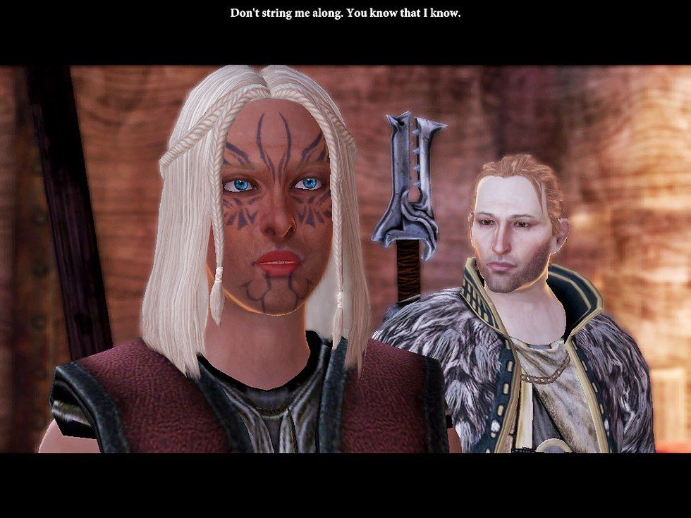 Horoscope: Dude. You have to stop with the whole “I’ll hurt you if you get too close thing.” You definitely flirt with Hawke way too much and you’re crazy if you don’t think I’m hitting every single “heart” response that comes up (no matter who I’m talking to). We’ve heard that line way too much before! Besides, it’s kinda cool when you get all glow-y and demon-voice-y. You will soon be faced with a decision on whether to go on the Deep Roads Expedition with Hawke (sort of; I’ve already decided you’re going, sorry) and your presence will be invaluable because of your healing skills. Don’t leave your friends behind when they need you the most. And try to keep control of that demon inside of you. Don’t let it kill everyone in sight, 'kay?
