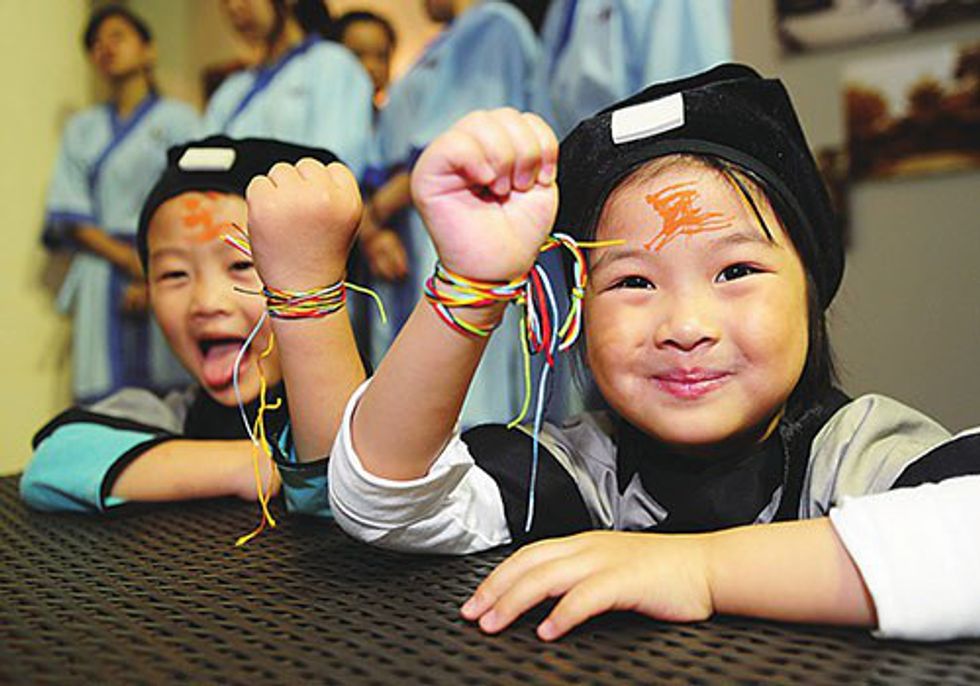 According to folklore, wearing the pouch protects children from evil; therefore, on this day children decorate their clothes with diversely fragranced pouches. The pouch is made of colourful silk cloth stringed with five-color silk thread. Also, the thread can be tied to a child's wrists, ankles, and around their neck. The five-colour thread is thought to contain magical healing properties.