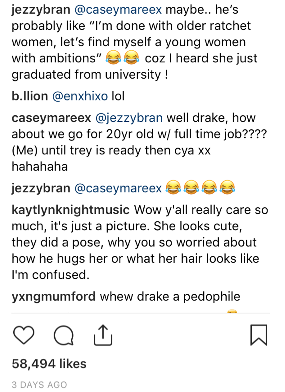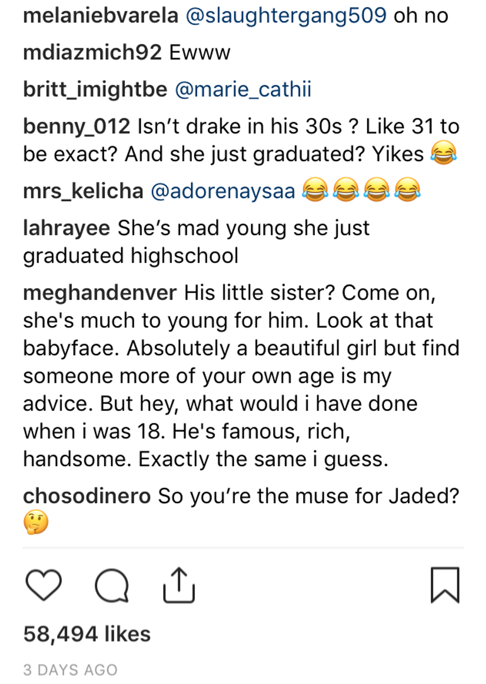 Rumors started swirling around on social media when the 18-year-old posted a photo of her and Drake's PDA on her Instagram page. The two looked more than just friends as they gathered closely for a couple of photos and a caption that read: "No place I'd rather be."
