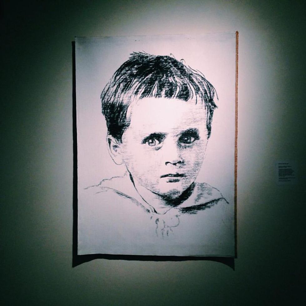 Bockelmann—who is well known in Germany and Austria—was typically recognized for his colorful, or monochrome, works in abstraction. Much of his work involved landscapes and horizons. In 2010 he drew his first portrait of a child murdered during the Holocaust: Prisoner #62287. We do not know his name, date of birth, or the circumstances surrounding his death. The child was murdered in Auschwitz. Bockelmann uses coarse charcoal and draws in black parallel lines to create his images. A majority of the images are about 5 feet in length and highlight the sunken, yet piercing, eyes of the lost innocents whom peer unforgivingly unto the audience. The portraits based on perpetrator photographs are featured on whitewashed canvas, while portraits replicated from family albums are drawn on untreated canvas—giving the portraits a sepia tone akin to the vintage photographs from which the images are based.
