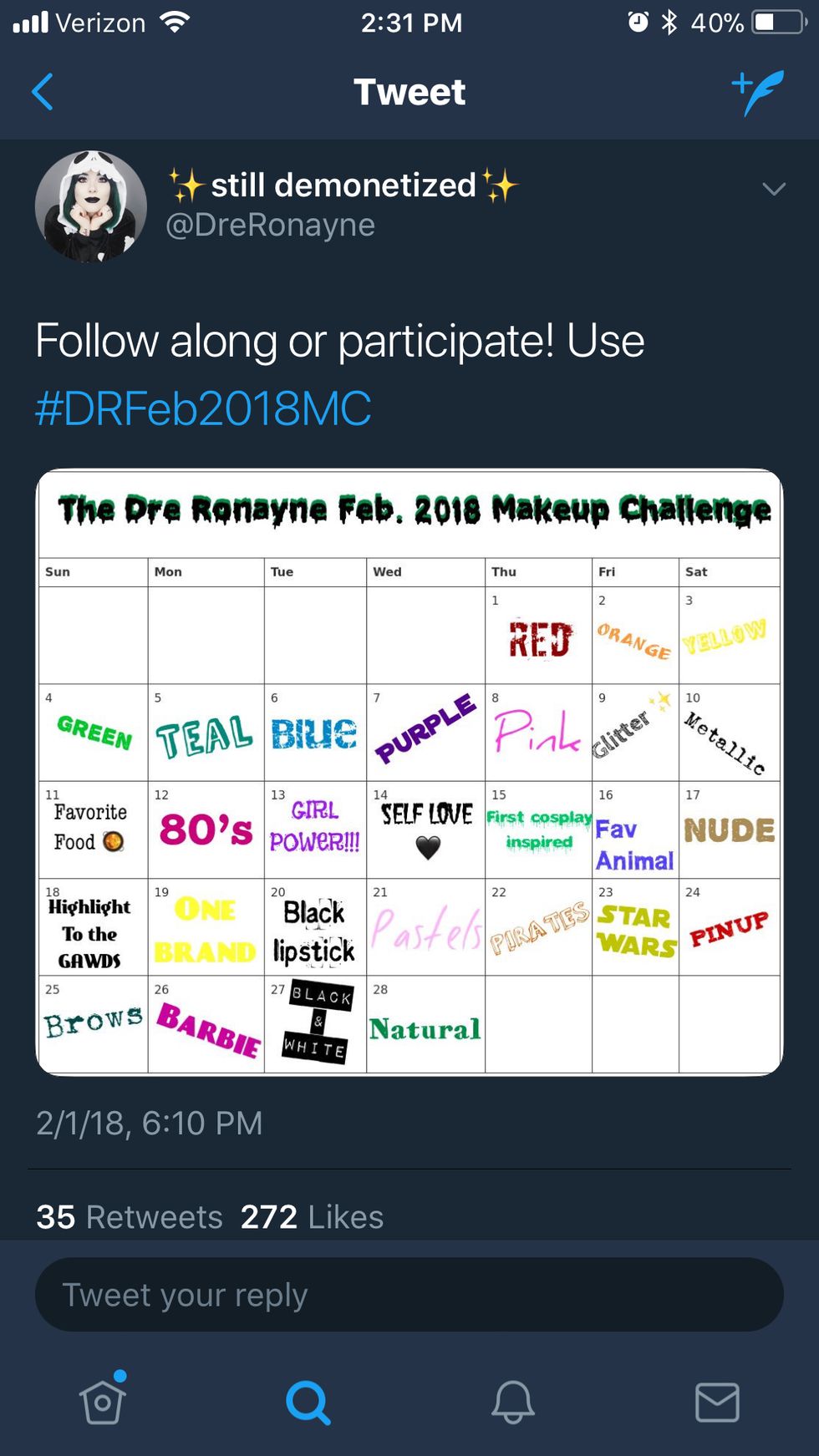 It is just what the hashtag looks like — Dre Ronayne's February 2018 Makeup Challenge. Each day of the month is something unique. Some are funky, some pretty tame, and others are out of this world. The hashtag has been used over 550 times on Instagram, and the number keeps jumping each day of the challenge.