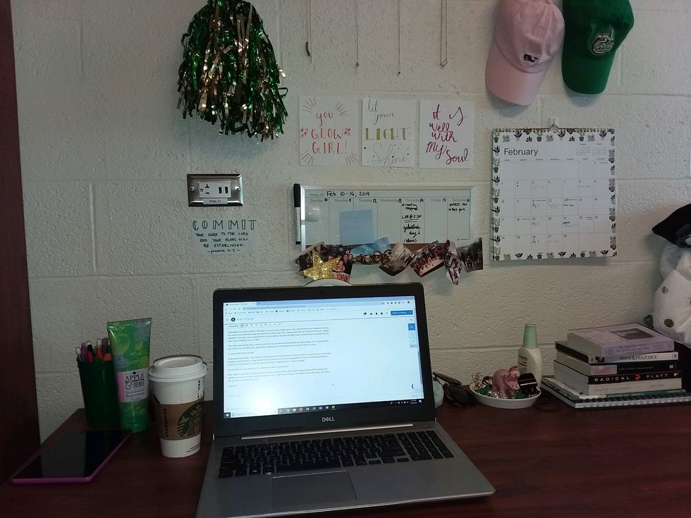Sure, my roommate is at the desk behind me (and giving me weird looks for taking a random picture of my desk,) but there is no real interaction here. There is no hum of conversation or creative brainstorming taking place in the background (you know, like they show in every movie about any journalist ever.) Instead, I am in my tiny dorm, trying to block out the rap music coming from the room next door, and attempting to ignore the weird smell wafting in from the hallway. Glamorous, right?