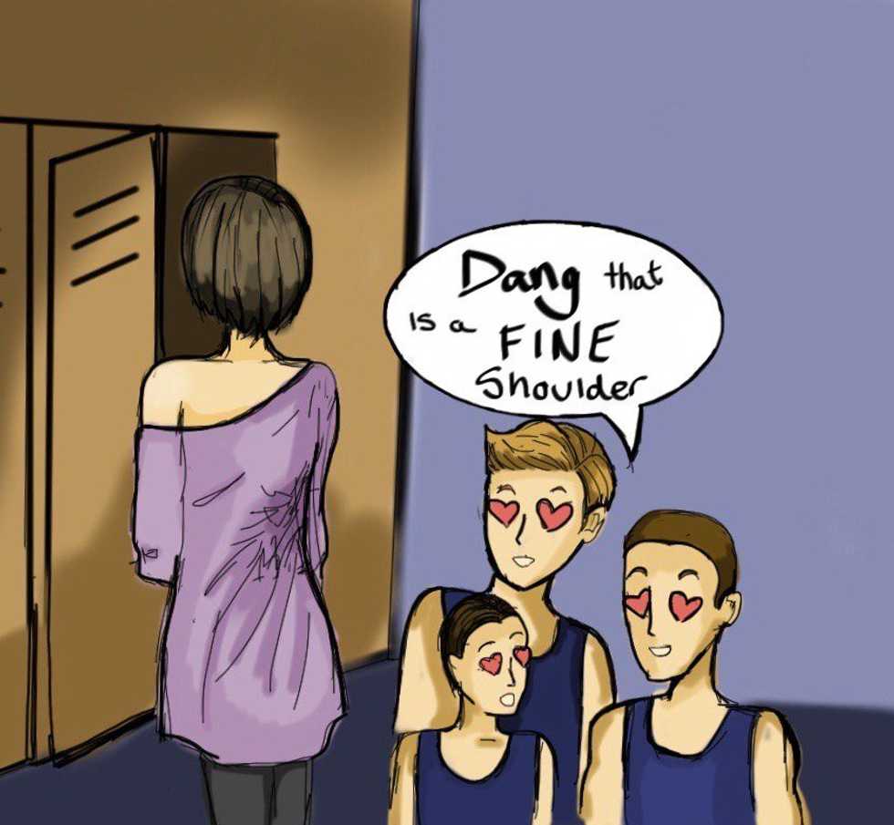 Similarly, my shoulders. Do guys have a sexual attraction to shoulders? Are shoulders a sensual item that just turns everyone into a sex-crazed dog? And, hey. My shoulders have few major differences from guy’s; why can guys wear wifebeater tanks, but my shirt in a similar design is a problem?