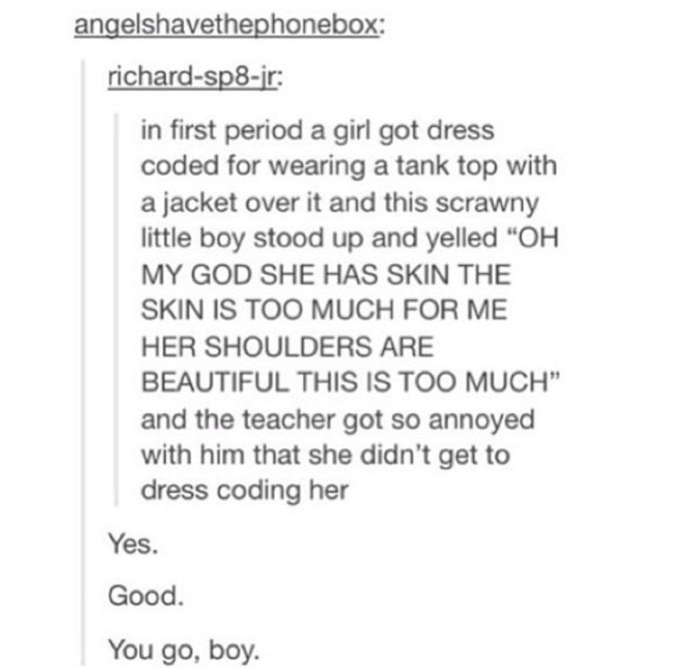 And that’s only a fraction of what cannot be worn. Even though my student handbook doesn’t specifically state that these rules are for only the girls, the clothing items pointed out were clearly feminine. By enforcing strict dress codes and claiming that shoulders and small portions of thighs are “disruptive to the educational process”, schools are also enforcing rape culture and slut shaming. I got dress coded for wearing a skirt that was a mere 6 inches above the knee and had to miss nearly an entire physics lecture, that is disruptive to the educational process...not my skirt. Do you see the irony?