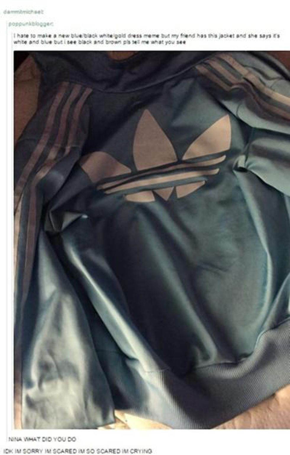 Well, there is now a jacket that is recreating the dress scenario. It’s an Adidas jacket that some see as blue and white while others see as black and brown and it’s making everyone freak out all over again. The picture was first posted on Tumblr and the caption read "I hate to make a new blue/black white/gold dress meme but my friend has this jacket and she says it's white and blue but I see black and brown pls tell me what you see."