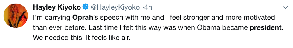 "I want all the girls watching here and now to know that a new day is on the horizon. And when that new day finally dawns, it will be because of a lot of magnificent women, many of who are right here in this room tonight, and some pretty phenomenal men, fighting hard to make sure that they become the leaders to take us to the time when nobody ever has to say 'Me too' again."