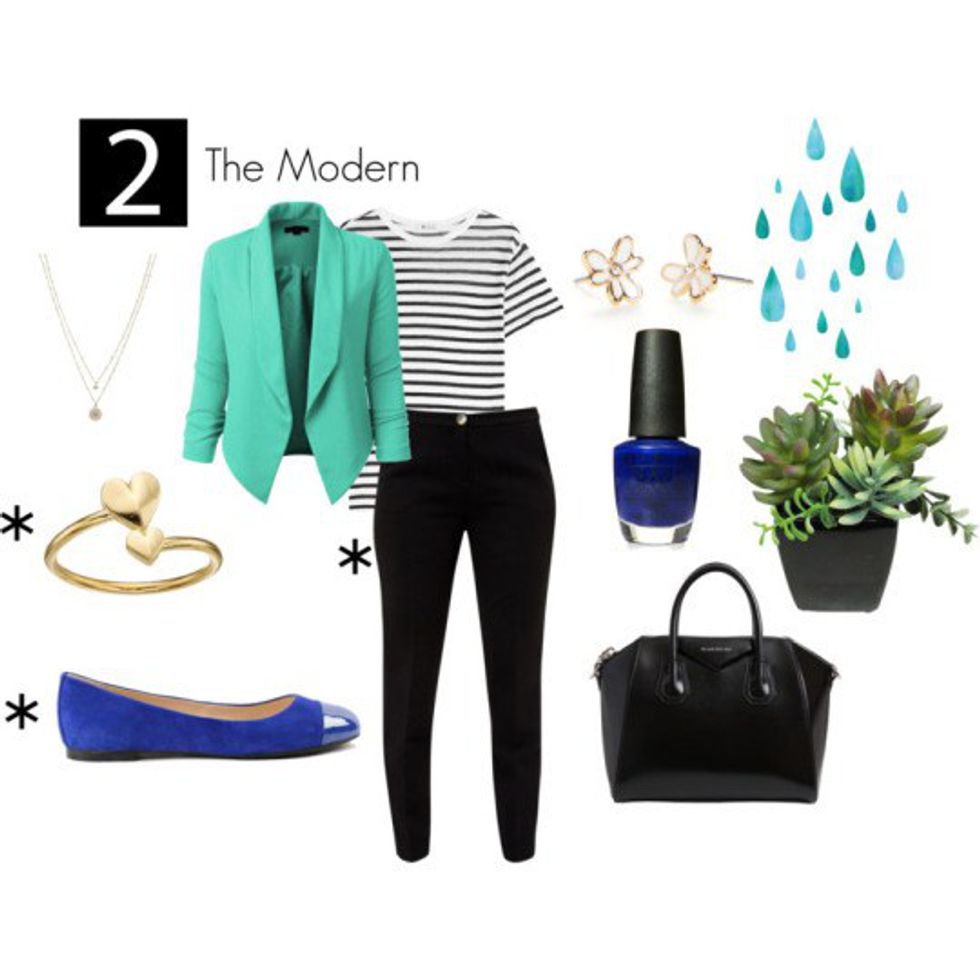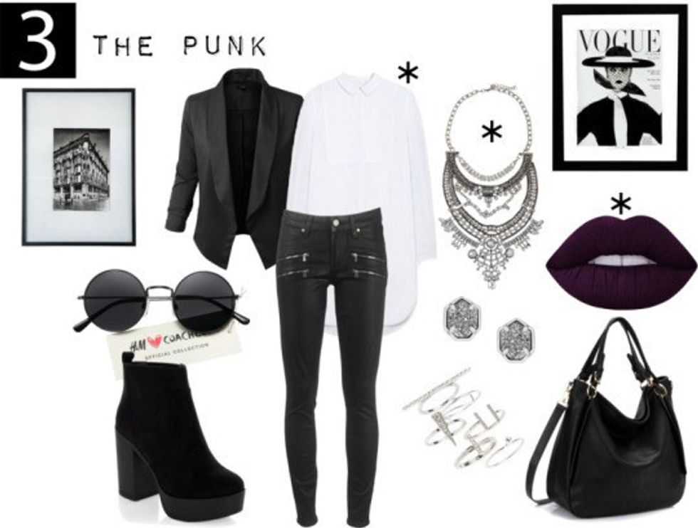 This is an edgier look. Sort of a punk-who-also-has-to pay-their-rent-with-a-day-job ensemble but it's perfect for after-hours anarchy, too. Okay, so most actual punks probably wouldn't say this was a punk look, but it will make you feel like a rockstar, nonetheless. With a loose, flowing top, form fitting faux leather pants, and cropped blazer, this will look good on everybody! And accessories really take this outfit to a new level because the pallet is so basic (in a good way). You can work a little more freely when adding jewelry and choosing accent pieces.