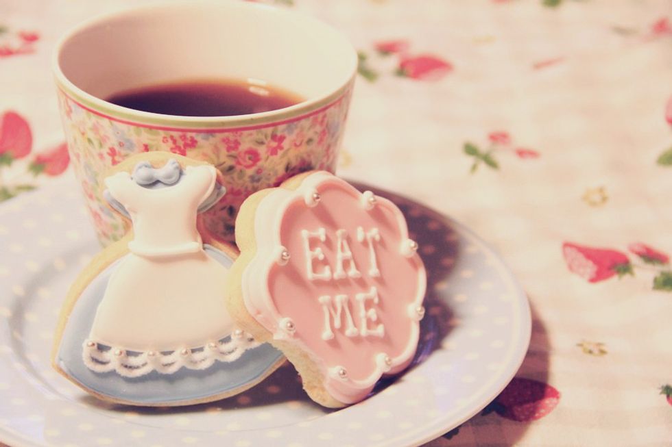 As Alice fell, her body became weightless, all the fear had left her mind, and she let go of everything. Down, down, down. Alice could not feel an end, she then opened her eyes to check her surroundings. She was falling rather slowly, and the walls of the hole were decorated with askew household decorations. She admired the crooked paintings and grabbed a hold of a beautiful, ancient teapot. There was still steaming tea in the pot, so she searched for a teacup as she fell. Once she found one, she gracefully poured herself a cup of tea and just as she placed the pot carefully on a shelf of a dresser, her bum hit the tile floor.