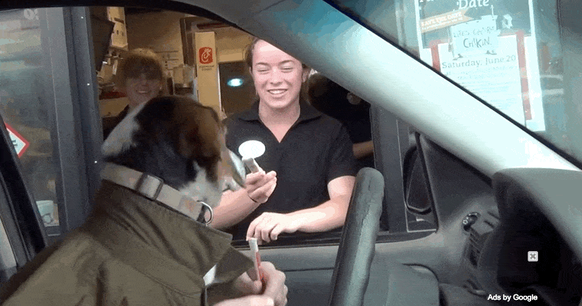 The best part of our day is when a dog comes through. We love petting them, giving them treats, and are more than willing to get them water if needed. However, if your dog is barking and growling at us, scaring us and the customers inside, that is not okay. Dogs barking in our ears at the speakers gives us headaches and is very annoying after a while. If I can't hear your order over your dog, that's not okay.