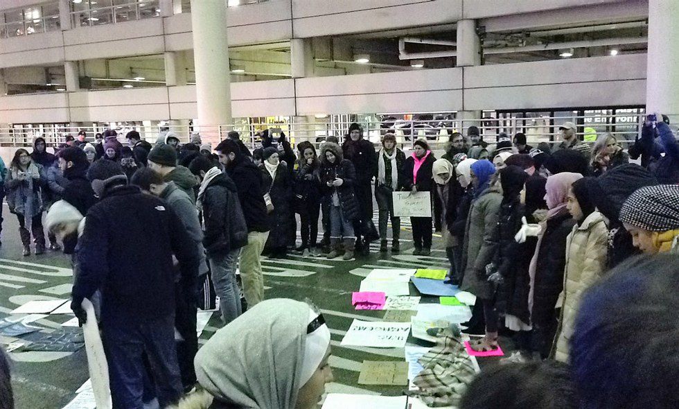 As the protest came to an end, hundreds gathered outside the terminal and formed a circle around Muslim protesters. Those with signs laid them down on the ground as a makeshift carpet, and dozens of Muslim Americans faced Mecca to pray. The outside circle acted as a barrier to create a safe space for their fellow Americans. It was an act of solidarity, love, and safety.
