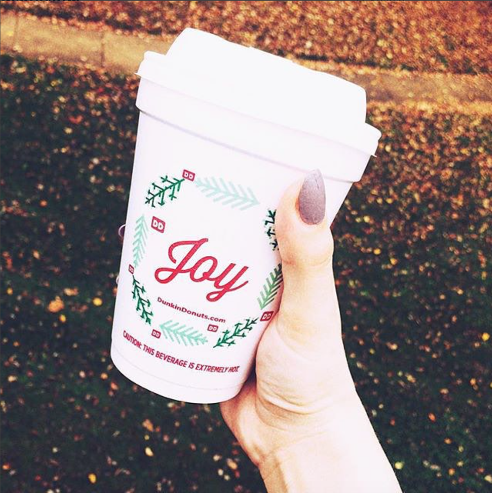 Some people believe that Dunkin' Donuts unveiled their cups in response to the Starbucks debate. The coffee chain, however, has actually been releasing holiday cups for years. Like Starbucks, the designs of Dunkin’ Donuts’ seasonal cups change each year, but Dunkin' always includes the word "Joy."