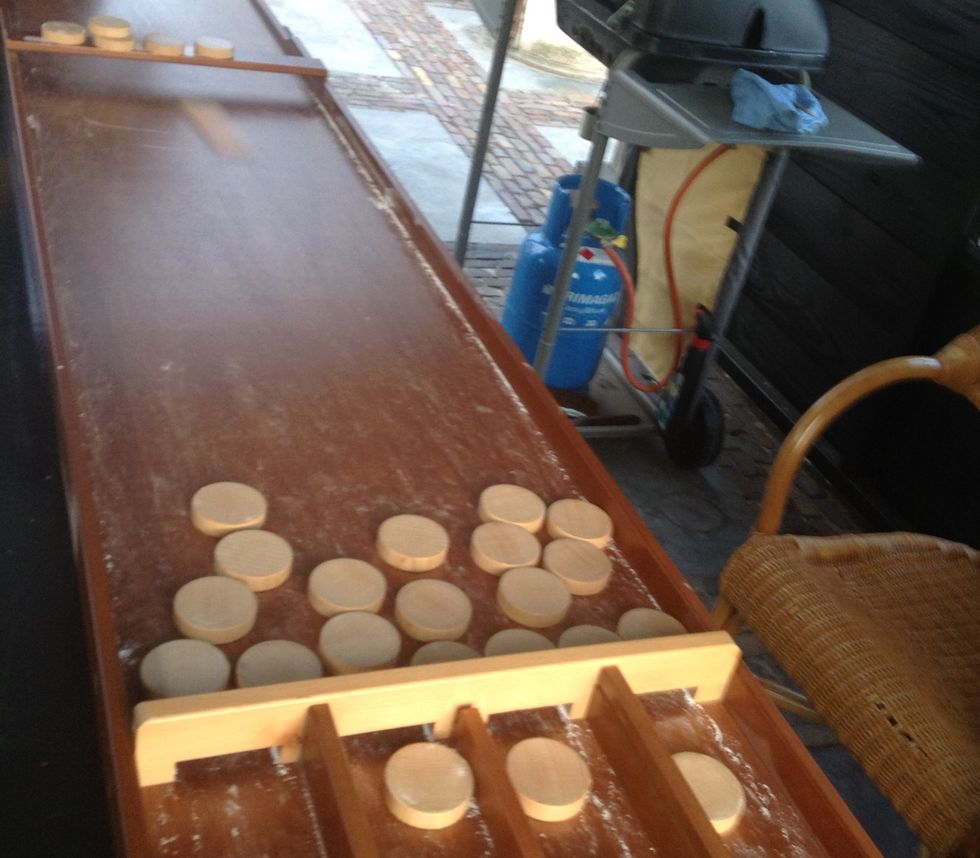 Sjoellen is another unique Dutch game, it is similar to shuffleboard. Sjoellen is a verb meaning to slide. There are two components two Sjoellen: Stennen and the Sjoellenboord. The Stennen, or stones, are thin hockey puck like objects made of smooth wood or stone. The Sjoellenboord is the playing board for the game. The board is generally between 4-6 feet long, and is characterized by point corrals. The point corrals are set up in this order: 2,4,3,1.