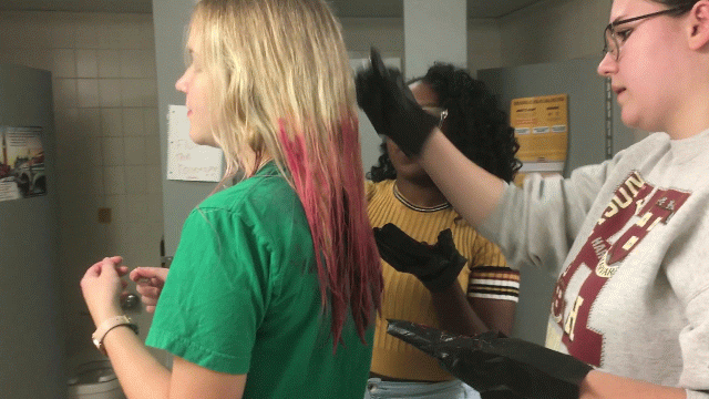 We rush back to school and add another layer of hair dye to Megan's hair, only instead of just the tips, her entire head is made pink. It is more than we expected, but it is fine because it's just a temporary dye. If she doesn't like it, she can always wash the color out.