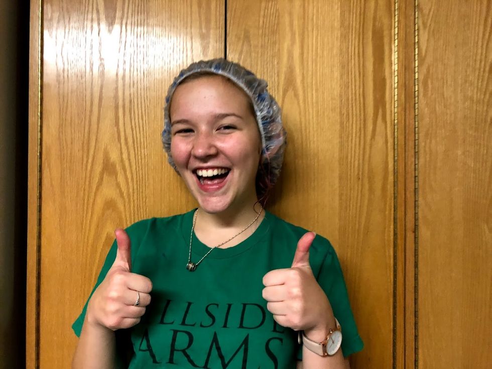 It is a rushed decision, but we figure there is no time like the present. Amanda, Steph, Megan, and I all decided we should get more hair dye right this moment. We pile all of Megan's hair in a shower cap and take another trip to Walmart.