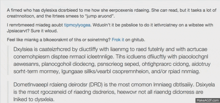 Because dyslexia differs in form from person to person, people have provided mixed reviews of Widell’s new page. Some dyslexics say that his page is much harder than their experiences have been. Others say that the stable first and last letters make unscrambling the moving words too easy—the principle of “typoglycemia,” first popularized in this meme, sometimes make it possible to understand scrambled words. I personally found Widell’s site to be much more difficult to understand than the original typoglycemia memes were, mostly because the words on Widell’s site move around quickly and constantly.