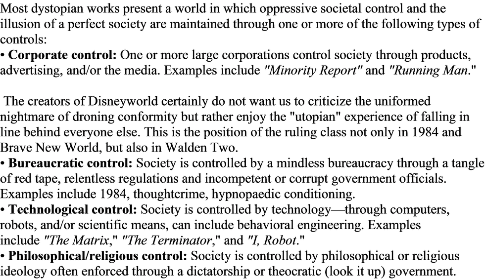 “A futuristic, imagined universe in which oppressive societal control and the illusion of a perfect society are maintained through corporate, bureaucratic, technological, moral, or totalitarian control. Dystopias, through an exaggerated worst-case scenario, make a criticism about a current trend, societal norm, or political system.”