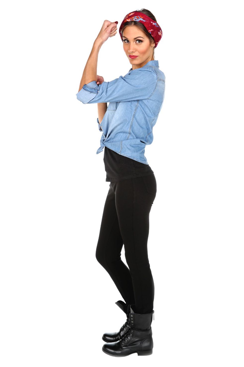 Show some sass while representing this iconic woman. Start by wearing a jean button up shirt with black skinny jeans or leggings on bottom. Tie a nice red bandanna in your hair and throw on some brown combat boots. Top off this look with red lipstick and show off the guns.