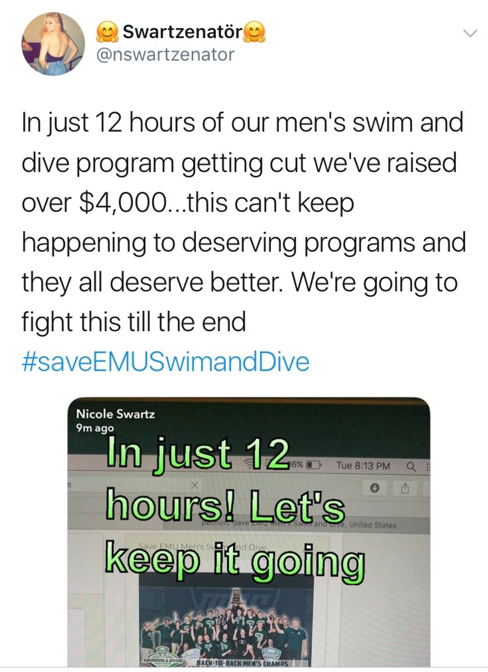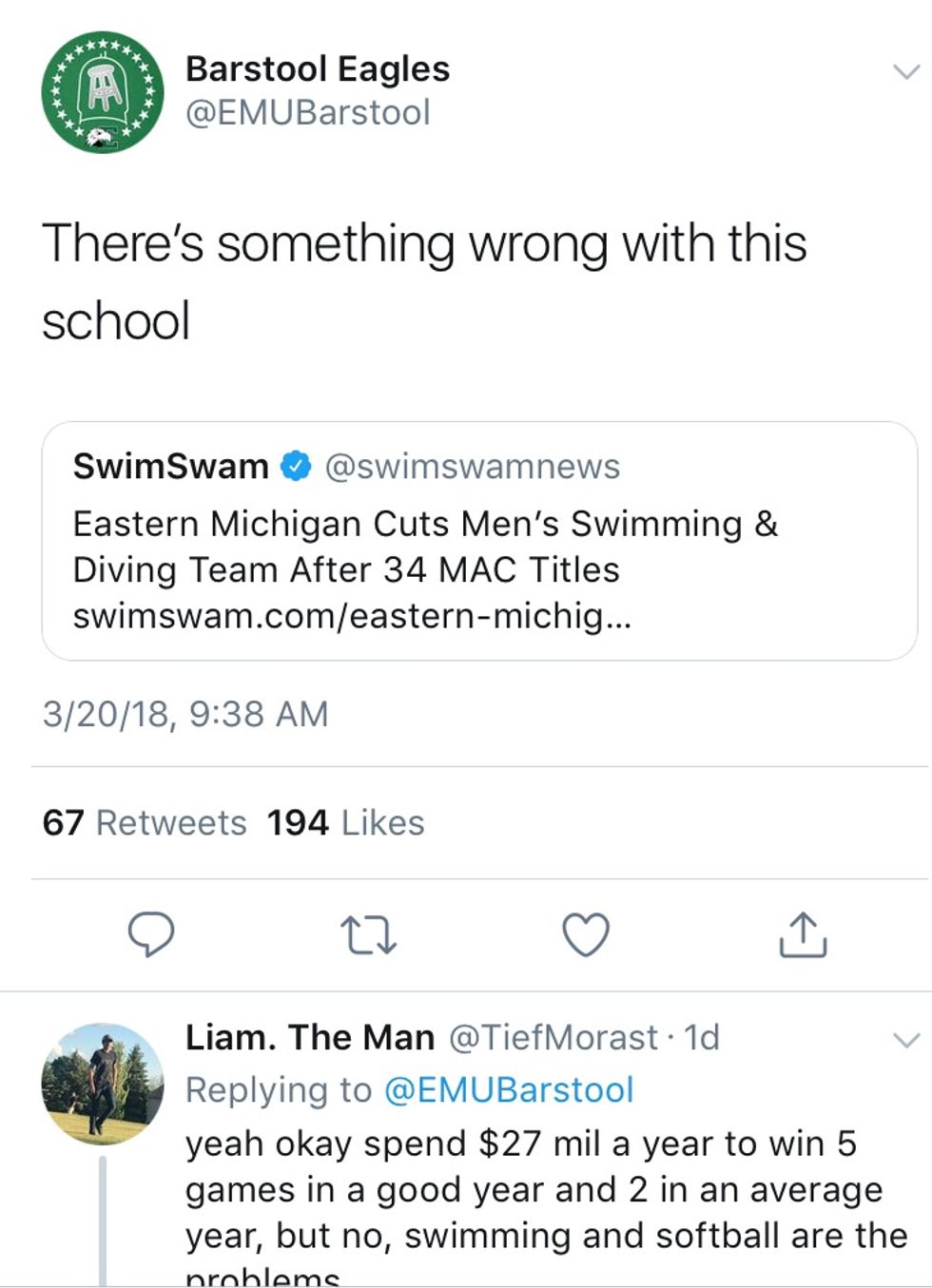 As a swimmer myself who even looked into swimming at Eastern Michigan, I cannot help but feel passionate about the issue. Not only is this affecting the student-athletes at EMU, but the entire swimming and athletic community at Eastern. How is it justified to punish the most decorated athletic program on campus after years of success? How is it justified to drastically alter their futures after a lifetime of hard work?
