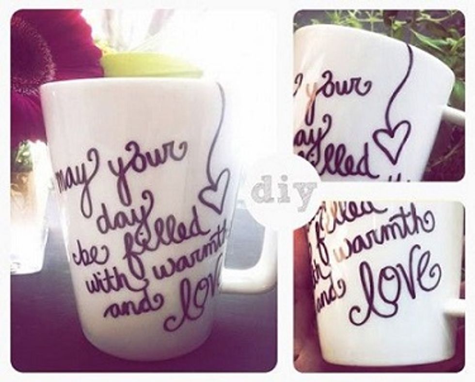 1. Mugs for Mom. This gift is great for any moms who are coffee, tea, or hot chocolate drinkers! You can buy light colored, oven-safe mugs from mostly any store -- even the Dollar Store! Use sharpies to decorate and customize the mug with any patterns or messages of your choice. Allow the ink to dry for about 24 hours. Then place the mug in the oven and let it bake in 375 degrees for 30 minutes. This will make the designs permanent so they won't wash off. Let it cool and you are all done!