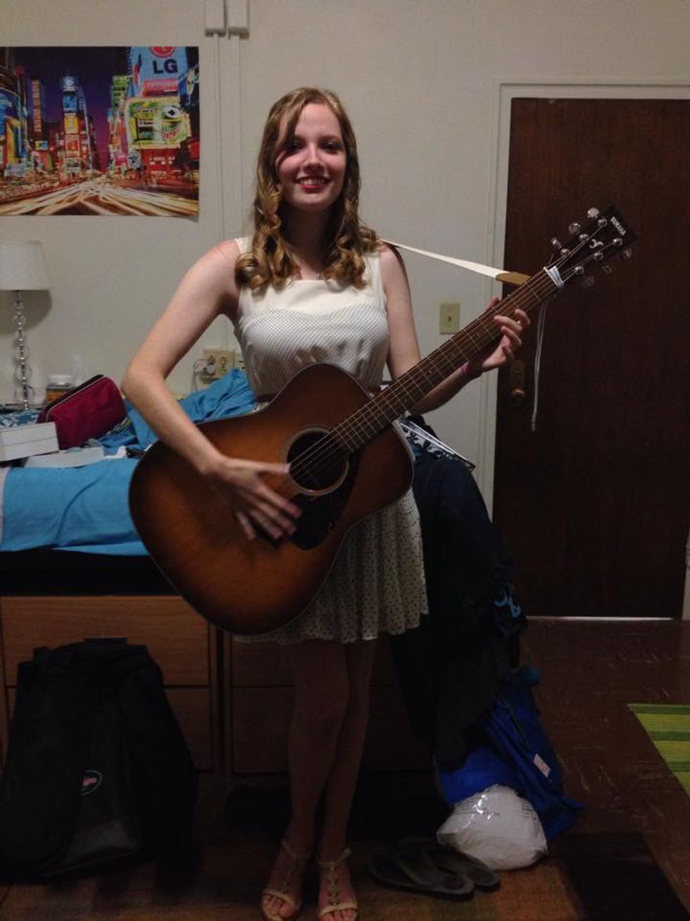 A cute dress and simple heels, curled hair and an acoustic guitar complete this look.