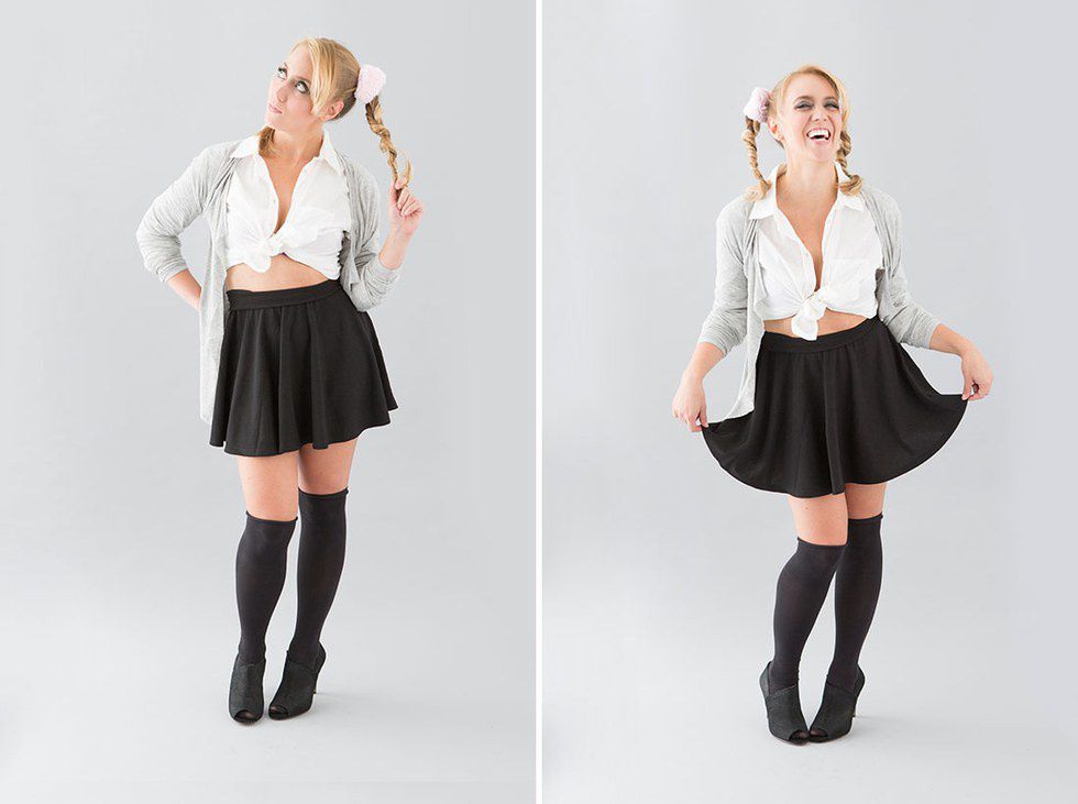 A short black skirt, a white blouse, and ridiculous pigtails not to mention a dark knee socks.