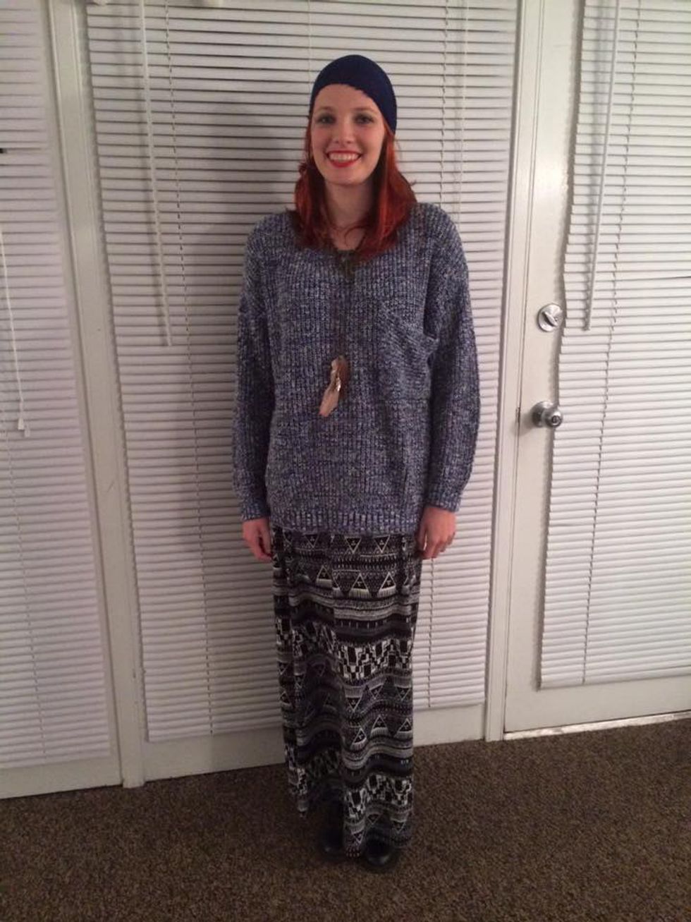 A maxi skirt, baggy sweater, and a large pendant necklace. Wrap your hair in a scarf and that's all it takes.
