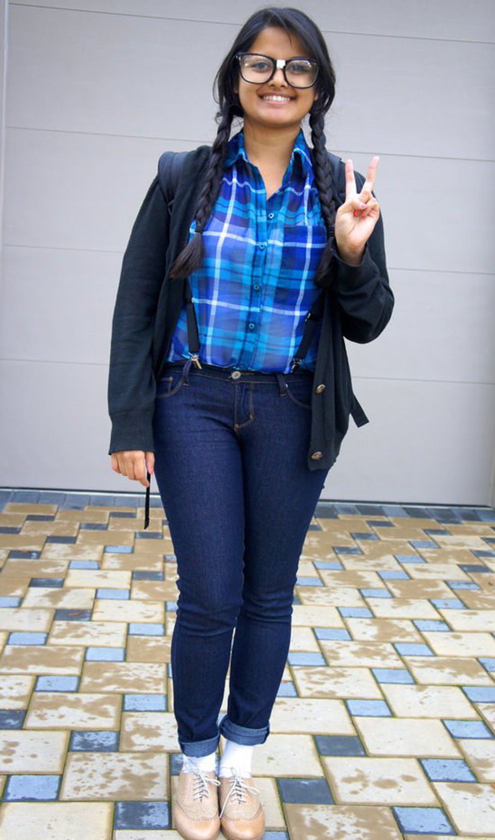 A plaid shirt, jeans and black eyeliner to draw lashes and smile lines on your face