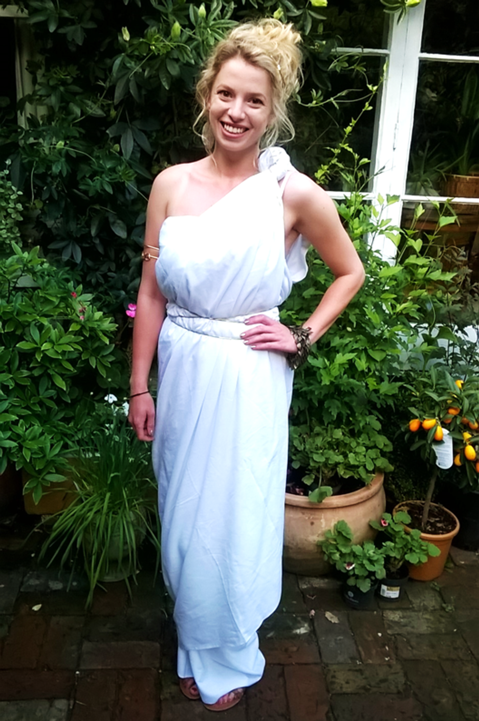 Have a white sheet sitting at home? Create a toga and secure it with a thin belt. Curl or style your hair and voila! You're done! This can also be done using sheets that do not have patterns on them.