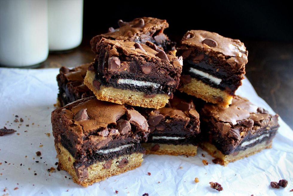 3. Mix brownie batter according to box instruction. Spread on top of Oreos and cookie dough.