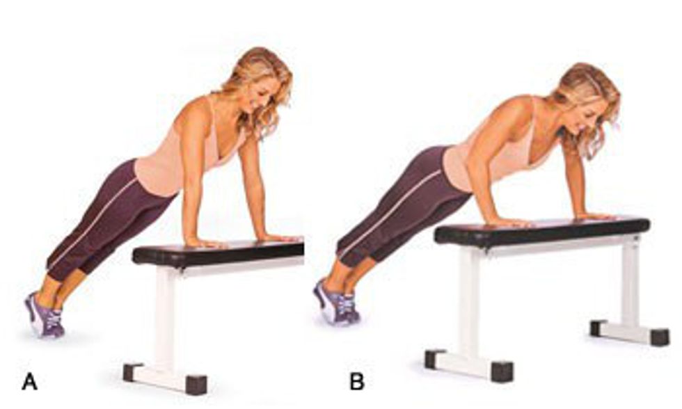 These pushups are great for two reasons: you can do them in your room and they're rather easy compared to normal pushups. Put your hands on a sturdy piece of furniture (a bed or desk works best), straighten your arms, and bring your body down towards the furniture as if you were doing a regular pushup.