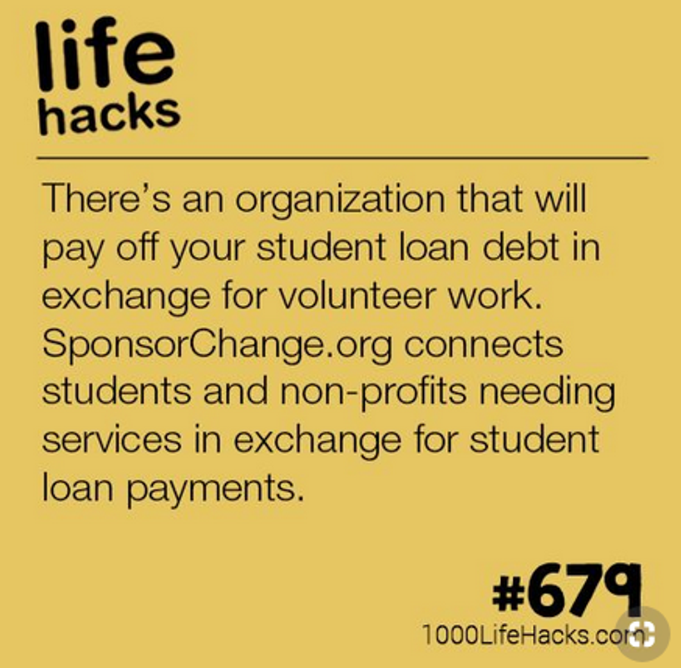 You can volunteer during college or after graduation to get help paying off student loan debt! Check out SponsorChange.org to see how you can get help paying off your student loans by helping others!