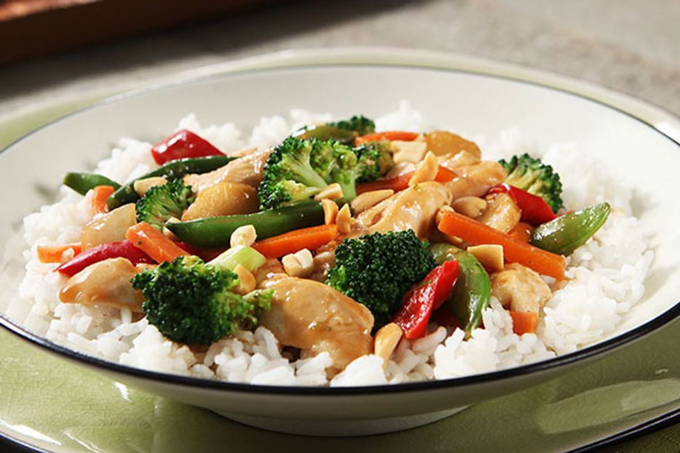 Cook a meat and whatever vegetables you've got in a pan and then add some rice and you're done.