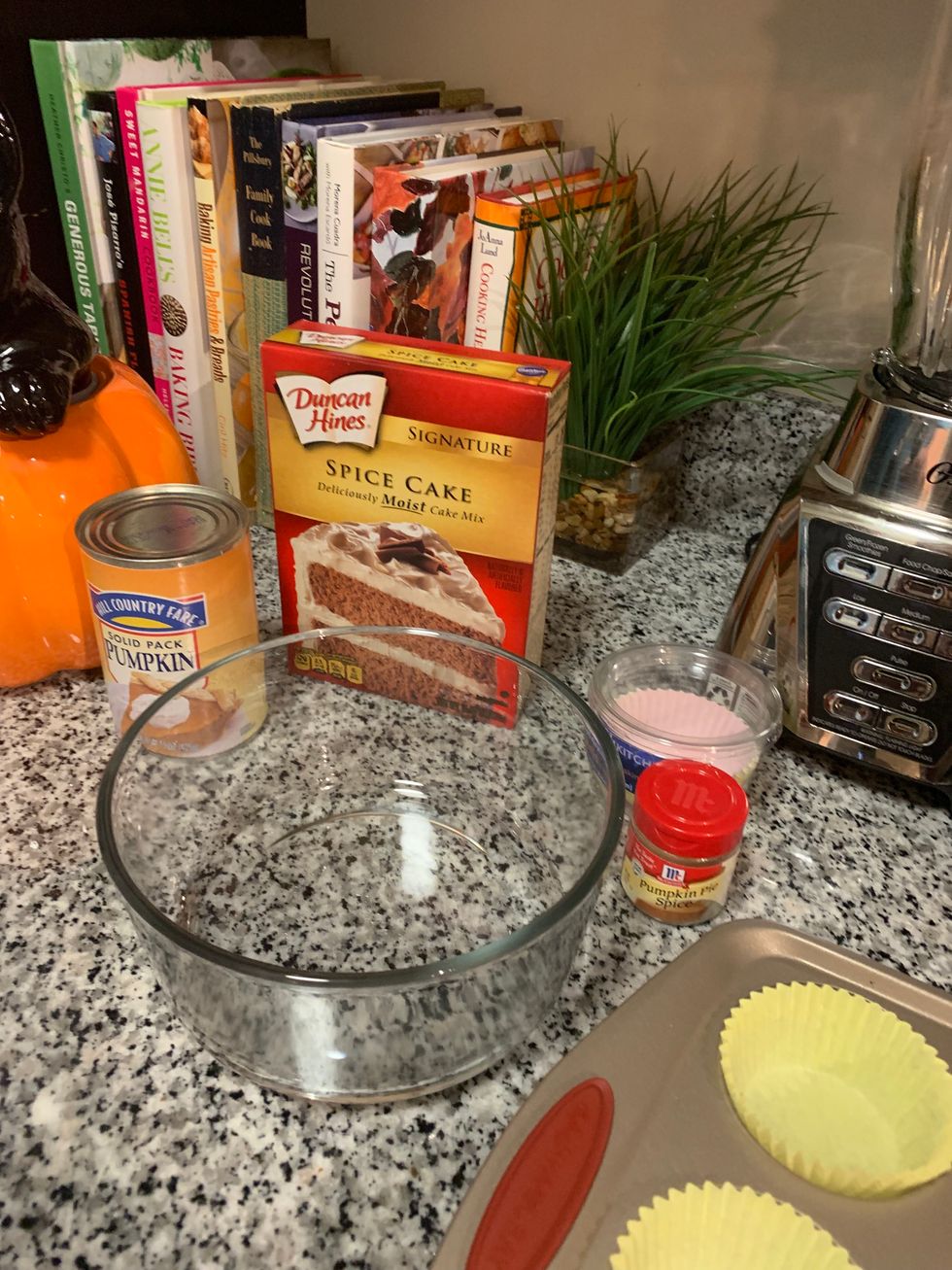 Combine the spice cake mix and canned pumpkin thoroughly. Add vanilla extract, chocolate chips, and pumpkin pie spice as wanted. Distribute approx. 1-2 tbs. into each muffin tin and sprinkle pumpkin pie spice on top. Bake 15-20 min at 350 degrees F, or until doughy!