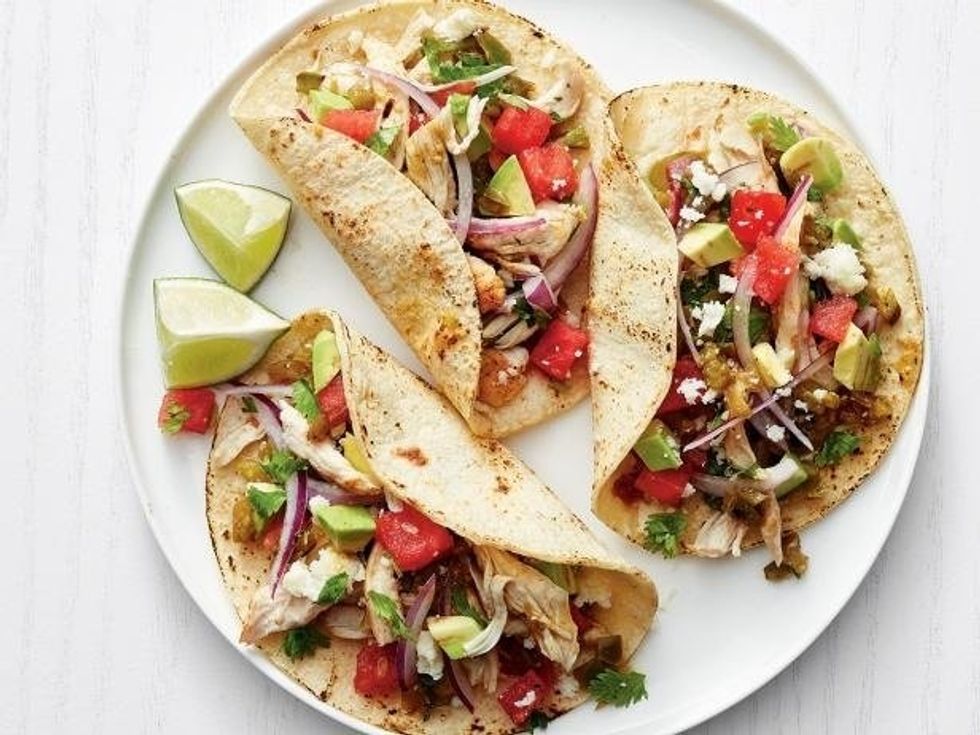 Step 4: Heat your preferred tortilla in a skillet until warm and crisp, flipping to heat evenly.For more step-by-step instructions, visit: https://www.foodnetwork.com/recipes/food-network-kitchen/chicken-watermelon-tacos-3364575