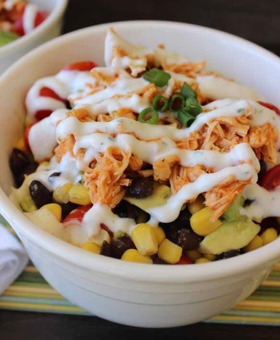 4. Create your bowls with prepared mixture and the buffalo chicken. Top with Greek yogurt dressing and serve!