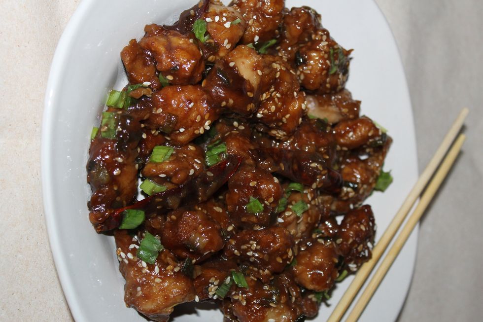Chicken (we use boneless chicken breasts), Oil, Garlic, Flour, Cornstarch, Egg whites, Soy sauce, Apple cider vinegar, and Sesame Seeds to top! Served best with white rice.