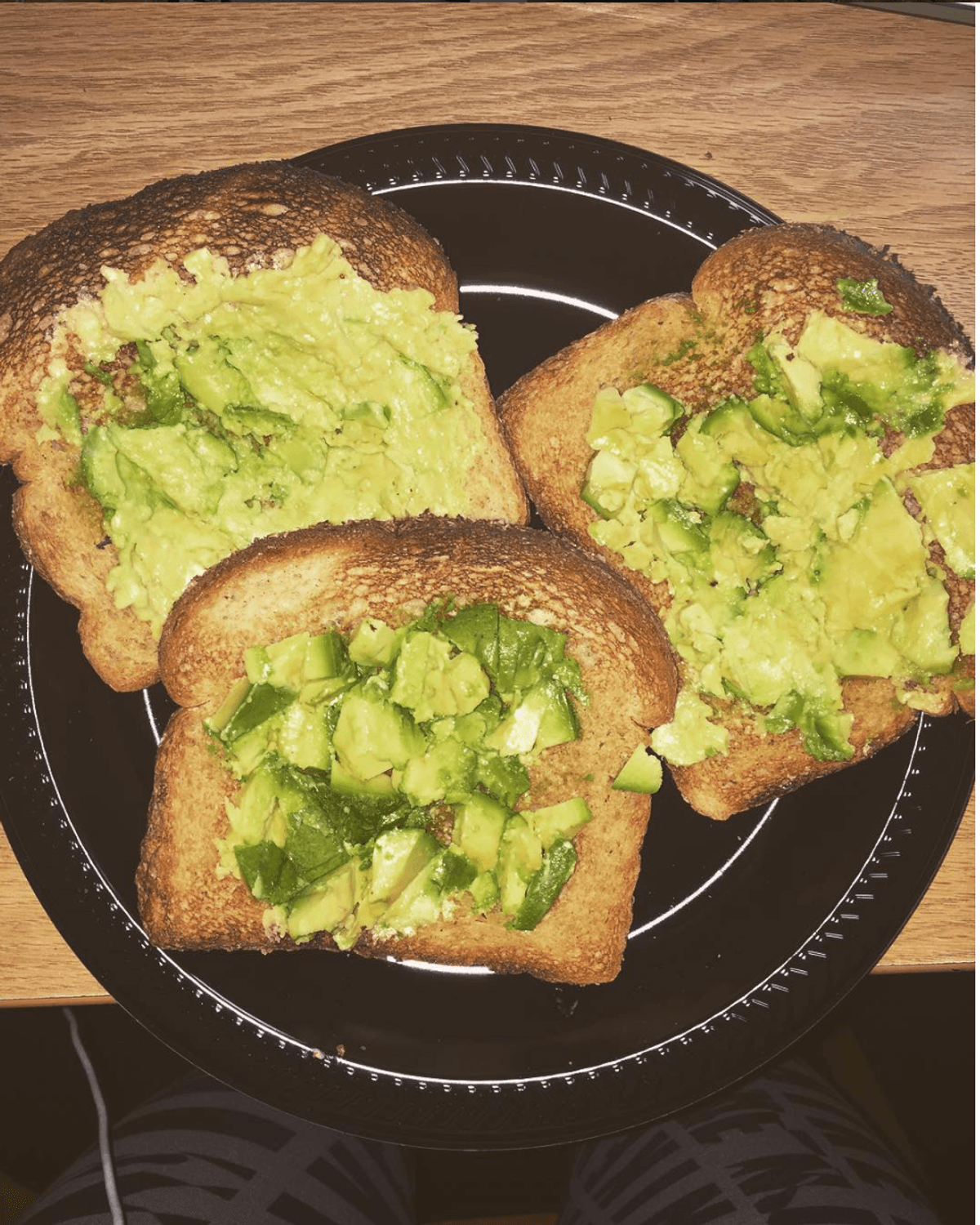 Avocado toast is one of my favorite snacks. All you need is some whole wheat toast and an avocado and you've got lunch! It can also be topped with pepper, chia seeds or a little bit of salt.
