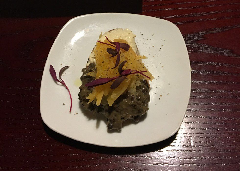 Course one was a serving of rutabaga toast with black beluga lentils and truffle-cashew puree: