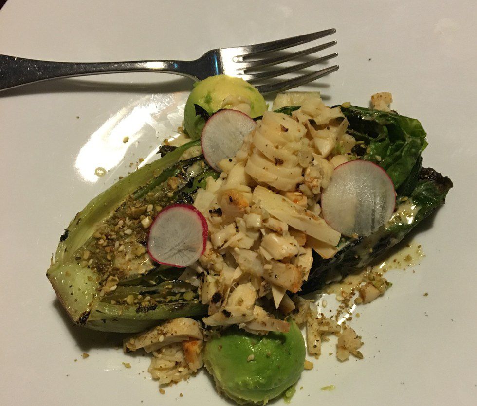 Three: a grilled baby romaine salad topped with hearts of palm & dressed with a lime-cumin-caper dressing. It was garnished with avocado and pumpkin seed dukkah. It was really fucking good: