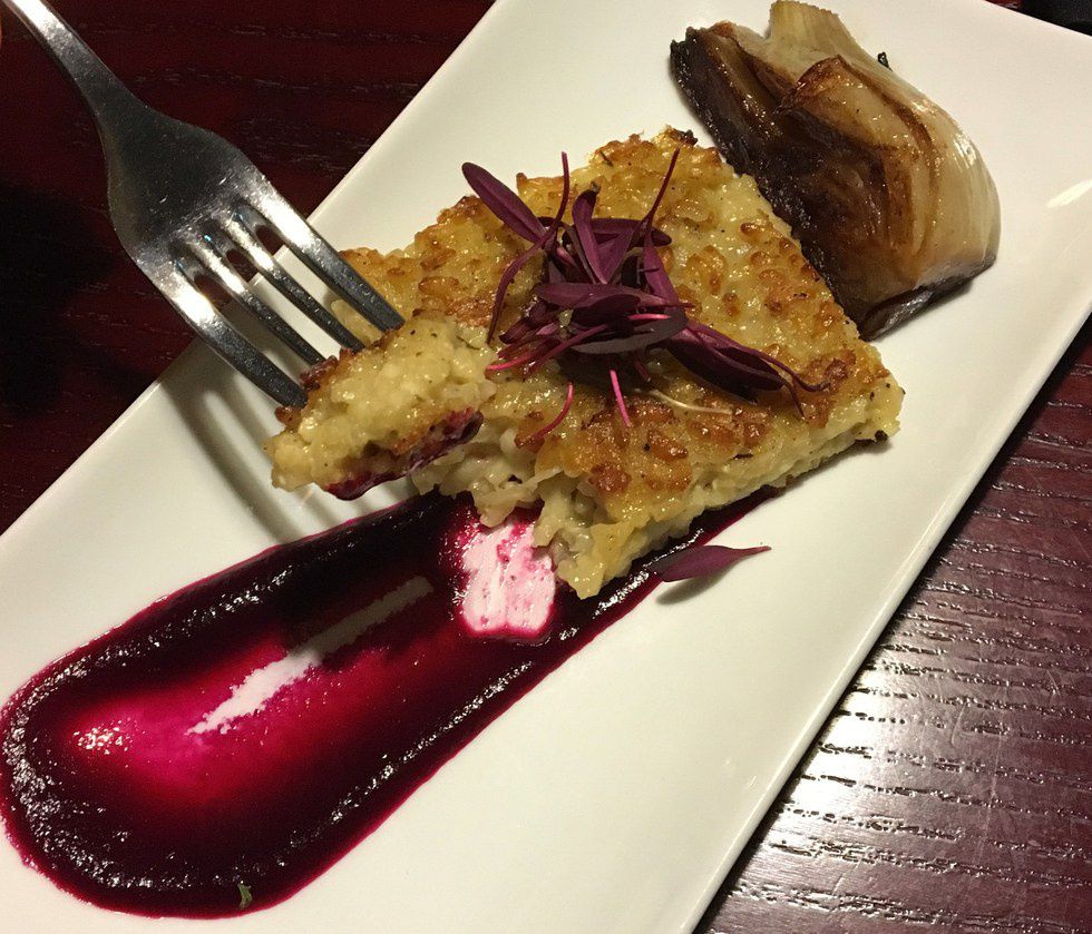 Course numero four consisted of a fennel risotto cake with smoked beet puree and red-wine braised fennel. And I was surprised that I liked this because I commonly refer to risotto as "that mushy rice dish." That is to say, I don't really care for risotto. But this was yummy: