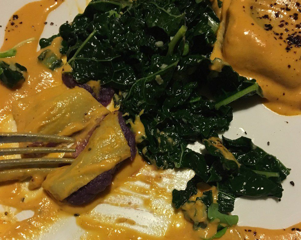 The last savory thing that I ate was my absolute favorite because it was tasty, but I also thought it was the most visually striking. Purple sweet potato ravioli, in a tomato-cashew-cream sauce with sauteed greens. When you cut in to the ravioli, the contents were a beautiful bright purple (my favorite color):
